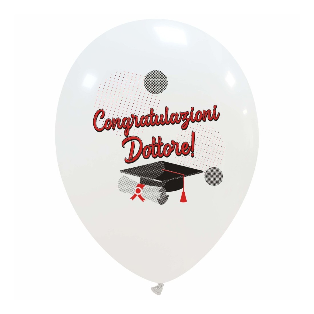 Palloncini bianchi da 12 pollici perfetti per il giorno della laurea, il disegno presenta una stampa a due colori con la frase "congratulazioni dottore". Un giorno indimenticabile merita dei palloncini eccezionali!