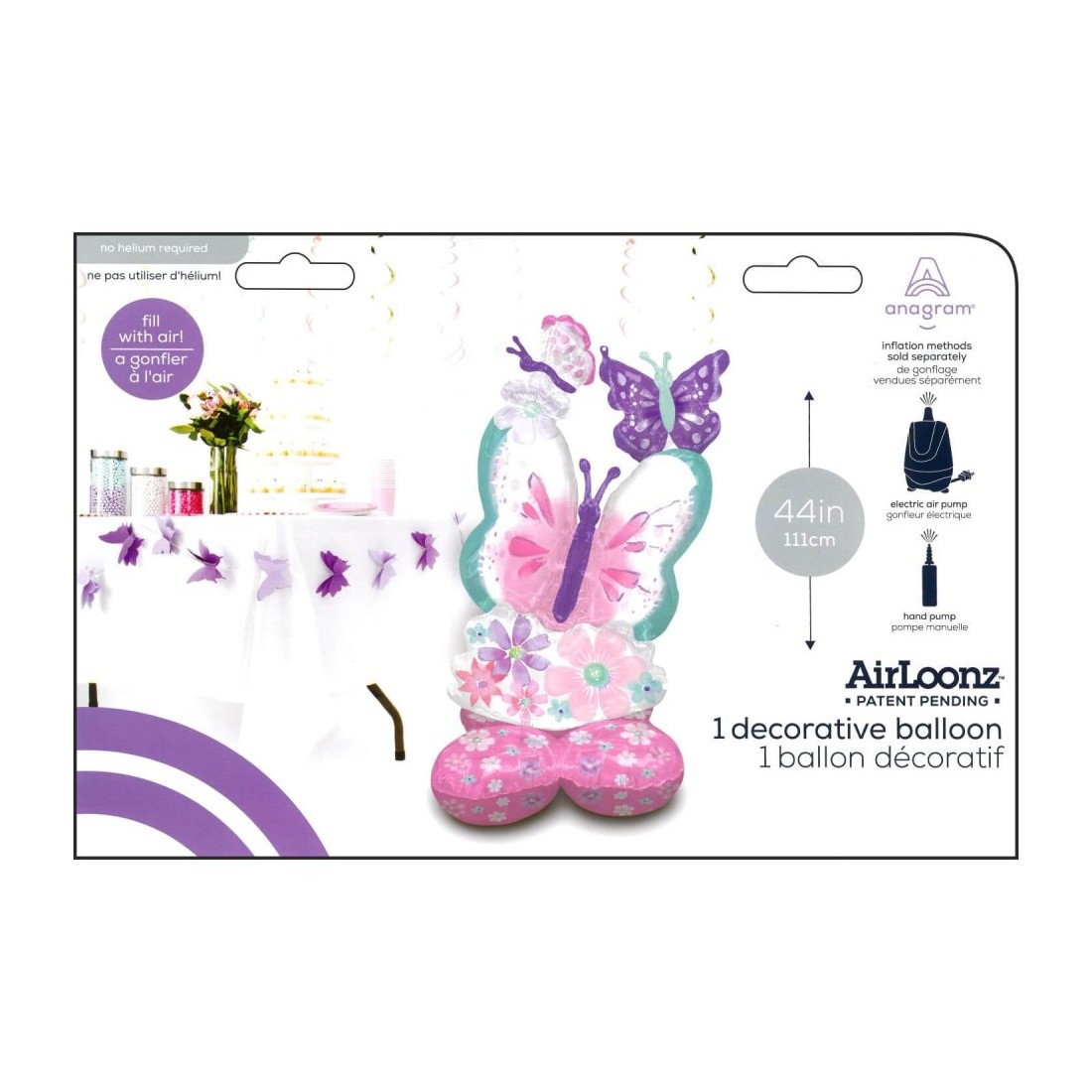 Palloncino mylar airloonz da 44 pollici con diverse farfalle in una composizione. Inserisci questo enorme palloncino ovunque nella tua decorazione e crea un ambiente bellissimo. I prodotti Airloonz raggiungono ben oltre i 100 cm di altezza!