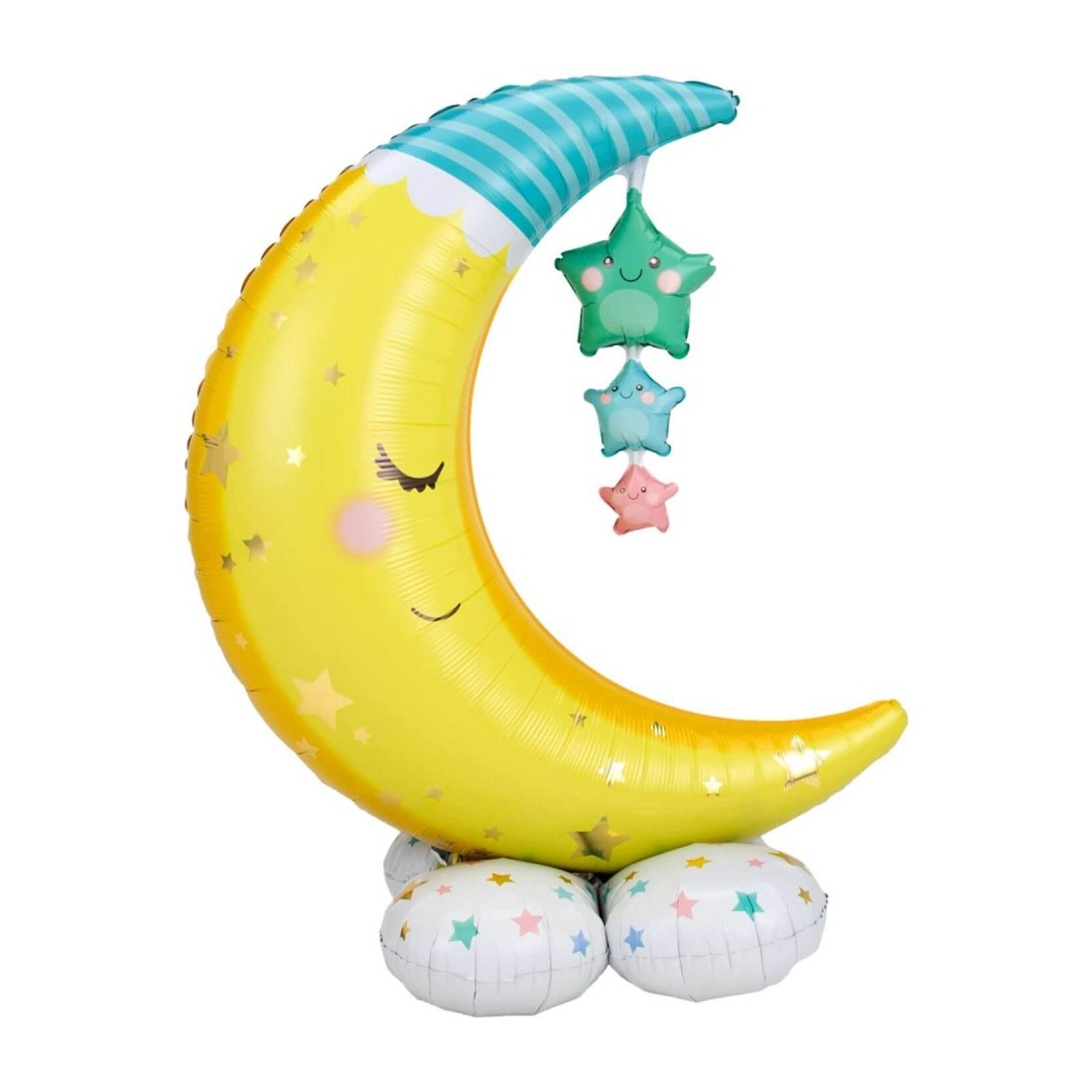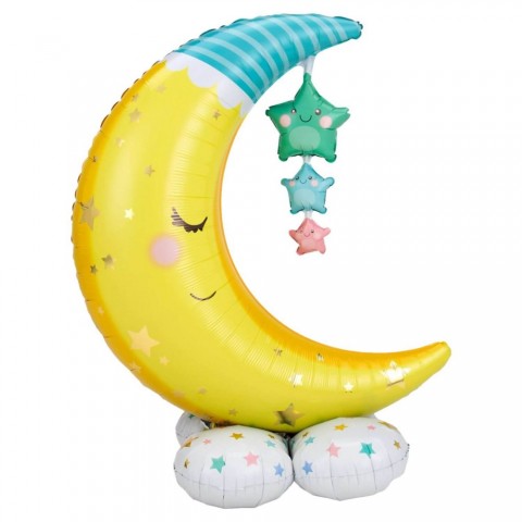Palloncini mylar Airloonz da 55 pollici perfetti per una nascita in famiglia. Il palloncino ha la forma di una luna con 3 stelline che pendono dall'alto, perfetto per una decorazione con palloncini. I prodotti Airloonz raggiungono ben oltre i 100 cm di altezza!