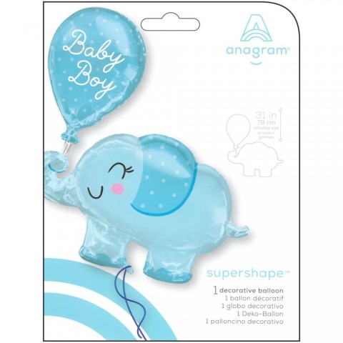 Palloncini mylar da 31 pollici perfetti per accogliere un nuovo bimbo in famiglia. I palloncini hanno la forma di un piccolo elefante blu che tiene un palloncino con la frase "baby boy".