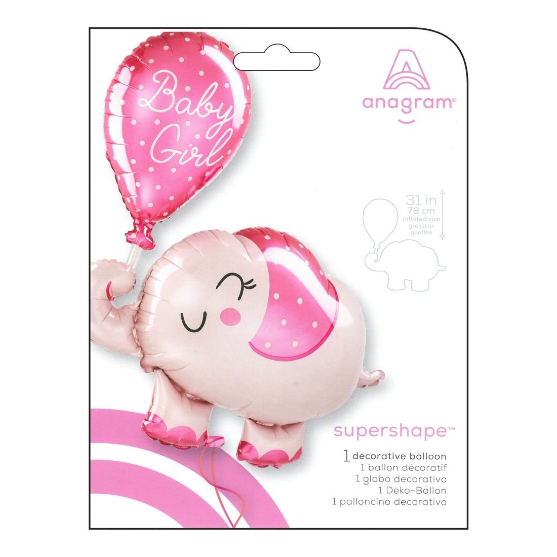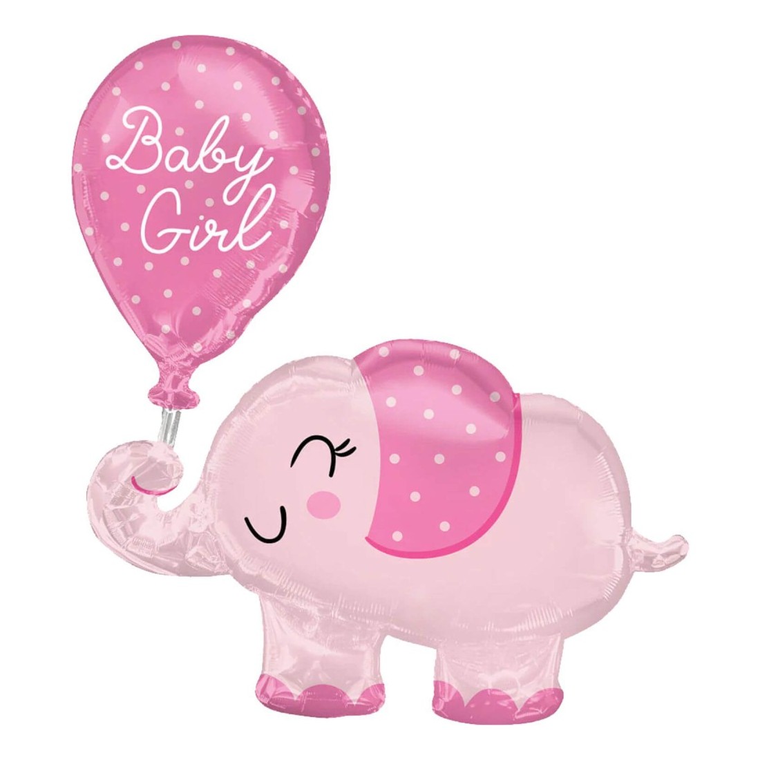 Palloncini mylar da 31 pollici perfetti per accogliere un nuovo bimbo in famiglia. I palloncini hanno la forma di un piccolo elefante rosa che tiene un palloncino con la frase "baby girl".