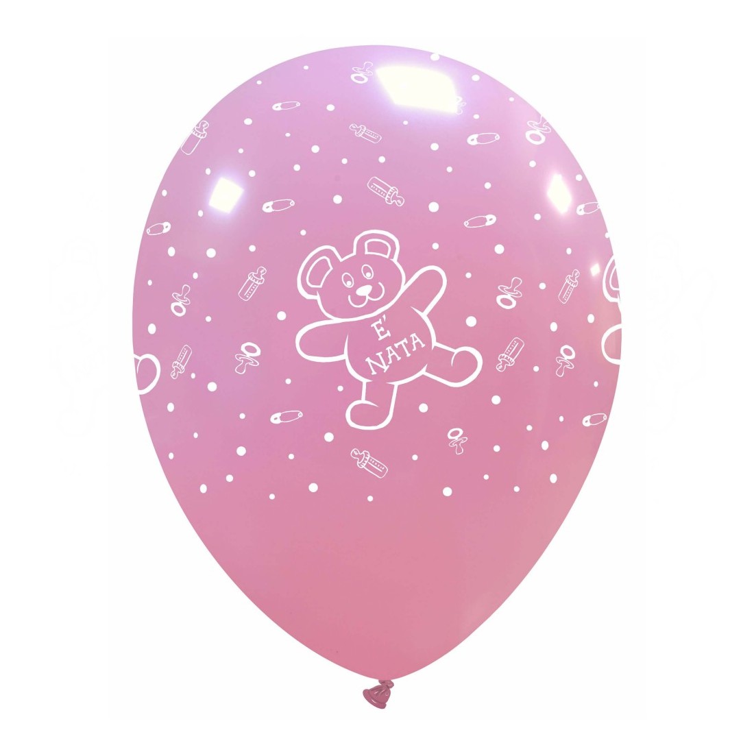 Palloncini rosa da 12 pollici perfetti per festeggiare un nuovo arrivo in famiglia. Sull'intera superficie del prodotto sono stampati: biberon, orsetti, ciucci, spille e pois con al centro la frase "it's a girl".