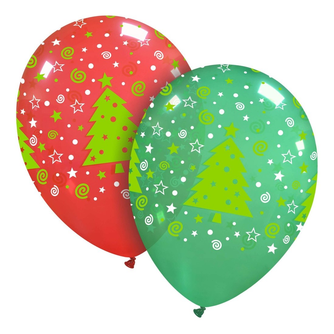 Palloncini verdi e rossi cristallo da 12 pollici. La stampa è presente sull'intera superficie del prodotto e mostra diversi alberi di natale circondati da fiocchi di neve bianchi.
