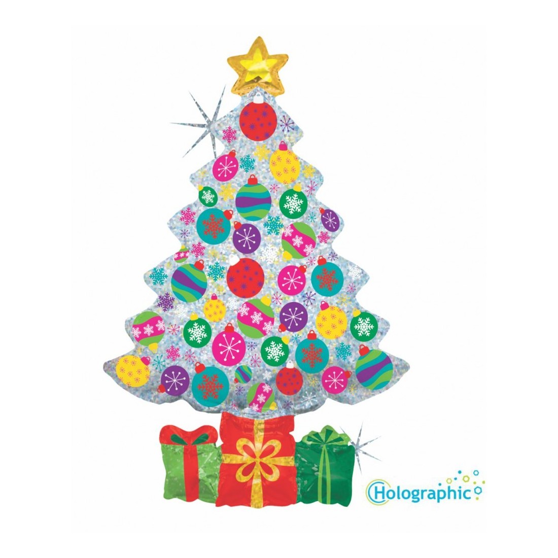 Palloncini olografici Mylar da 39" a forma di albero di natale, sono ricoperti da decorazioni natalizie che lo rendono perfetto per una festa a tema.